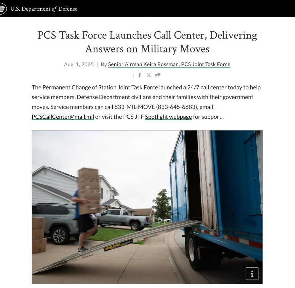 The PCS Taskforce launched a new Call Center for Customers. The Call Center can be reached at 833-MIL-MOVE (833-645-6683), email PCSCallCenter@mail.mil Click here to read the full article.